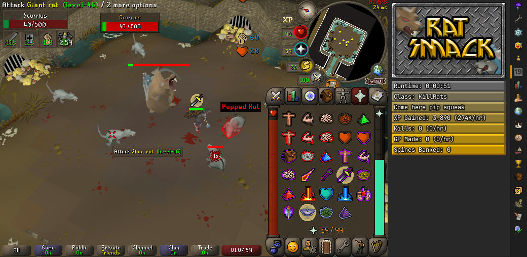 Rat Smack is a fully automated Scurrius boss fighter. Perfect for training combat stats early with minimal requirements. The plugin handles everything from fighting to banking, with special features like melee builder mode, loot juggling, and prayer restoration runs. Great for mains and ironmen alike.