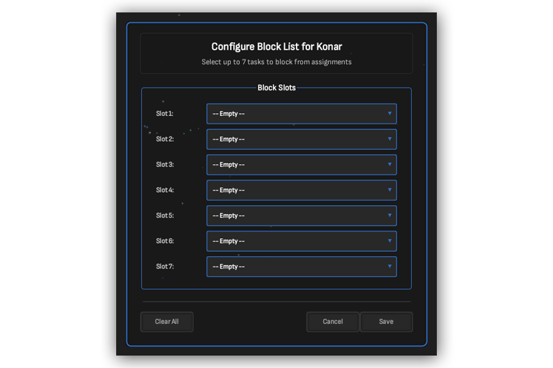 You can block up to 7 tasks from being assigned by each master.
