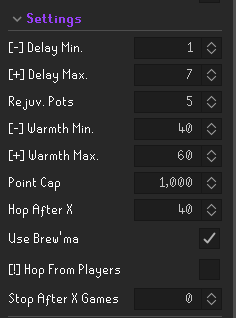💡 Recommended Settings: Don't run over 100k points as games can take up to 6 hours. High point games will likely get crashed and end early. Safe suggestion: 5-10k points, hopping every 5 games.